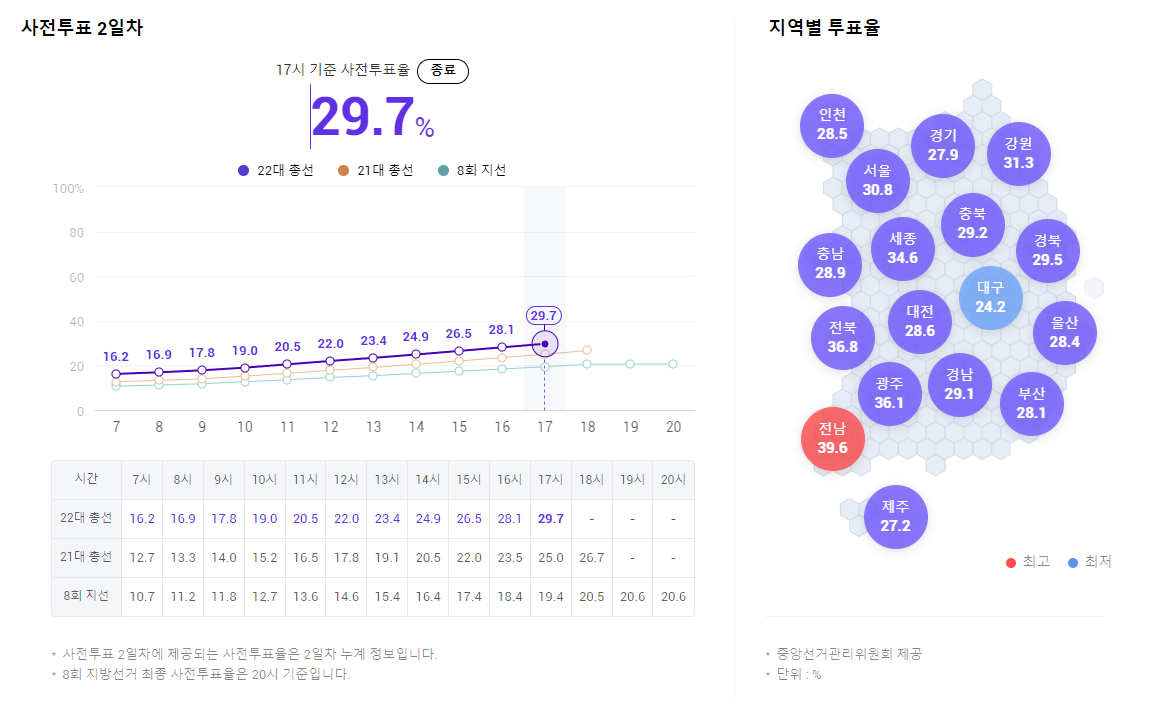 이번 제22대 국회의원선거 의 관심이 상당히 높은가 봅니다. 중앙선거관리위원회 자료에 따르면, 어제 오늘 4월5일, 4월6일 이틀간 치뤄진 사전투표가 역대최고치인31.3% 이고 투표자수는 1300만 정도입니다. 첫째날인 4월5일과 마찬가지로 전남 지역이 39.6% 로 사전투표율이 가장 높고, 대구 지역이 24.2%로 가장 낮은 수치입니다. 지역별 자세한 사전투표율이 궁굼하신 분은 아래 '사전투표율 보러가기' 링크에서 각 지역별 사전투표율을 확인해보세요. 이번 총선 사전투표율은 사전투표가 적용된 역대 총선 최고 기록이 될 전망입니다. 사전투표에 참여하지 못하신 유권자분들은 4월10일 선거일에 투표로 소중한 권리를 행사하시기 바랍니다. 사전투표율 보러가기