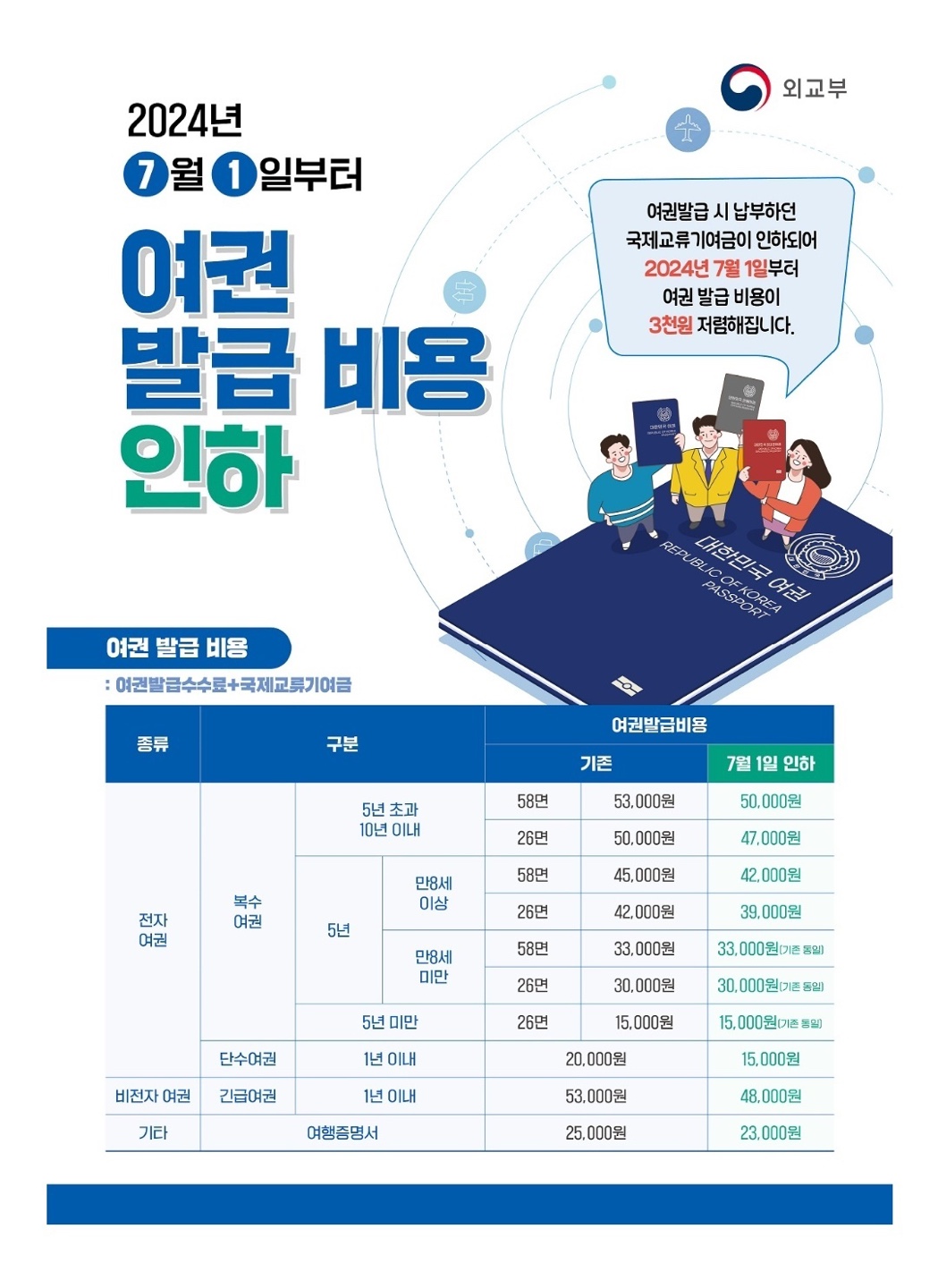 '한국국제교류재단법' 시행령 개정에 따라 여권 발급신청 시 납부하던 국제교류기여금이 인하되어, 2024년 7월1일(월) 부터 여권발급 비용이 낮아집니다. 주요 내용은 다음과 같습니다. 전자여권(복수여권) 발급비용 인하10년 유효 전자여권58면 : 기존 53,000원에서 50,000원으로 3,000원 인하26면 : 기존 50,000원에서 47,000원으로 3,000원 인하5년 유효 전자여권58면 : 기존 45,000원에서 42,000원으로 3,000원 인하26면 : 기존 42,000원에서 39,000원으로 3,000원 인하만 8세 미만 전자여권 비용은 기존과 동일 기타 여권 발급비용 인하단수여권(1년 유효) 및 여행증명서 발급 시 국제교류기여금 면제비전자여권(긴급여권) 발급비용도 일부 인하 대한민국..