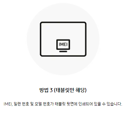 - 방법3(태블릿만 해당) IMEI, 일련 번호 및 모델 번호가 태블릿 뒷면에 인쇄되어 있을 수 있습니다.