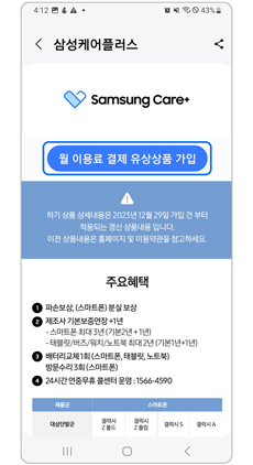 Samsung Members앱 > 혜택 > 삼성케어플러스 상품 가입하기 > 동의하기 > 월 이용료 결제 유상상품 가입 > 가입하기