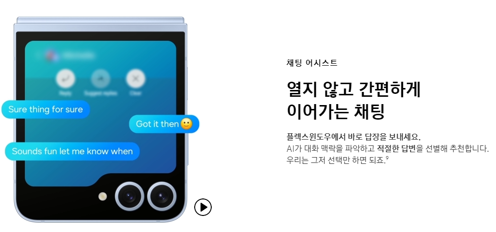 접었을 때의 디스플레이는 6.3인치로 약간 늘어났고, 이제는 바 타입 스마트폰처럼 사용할 수 있습니다. 디자인도 무광 마감과 반듯한 형태로 세련된 느낌을 줍니다. 컬러는 실버, 네이비, 핑크로 제공되며 네이비 컬러가 특히 인상적입니다.