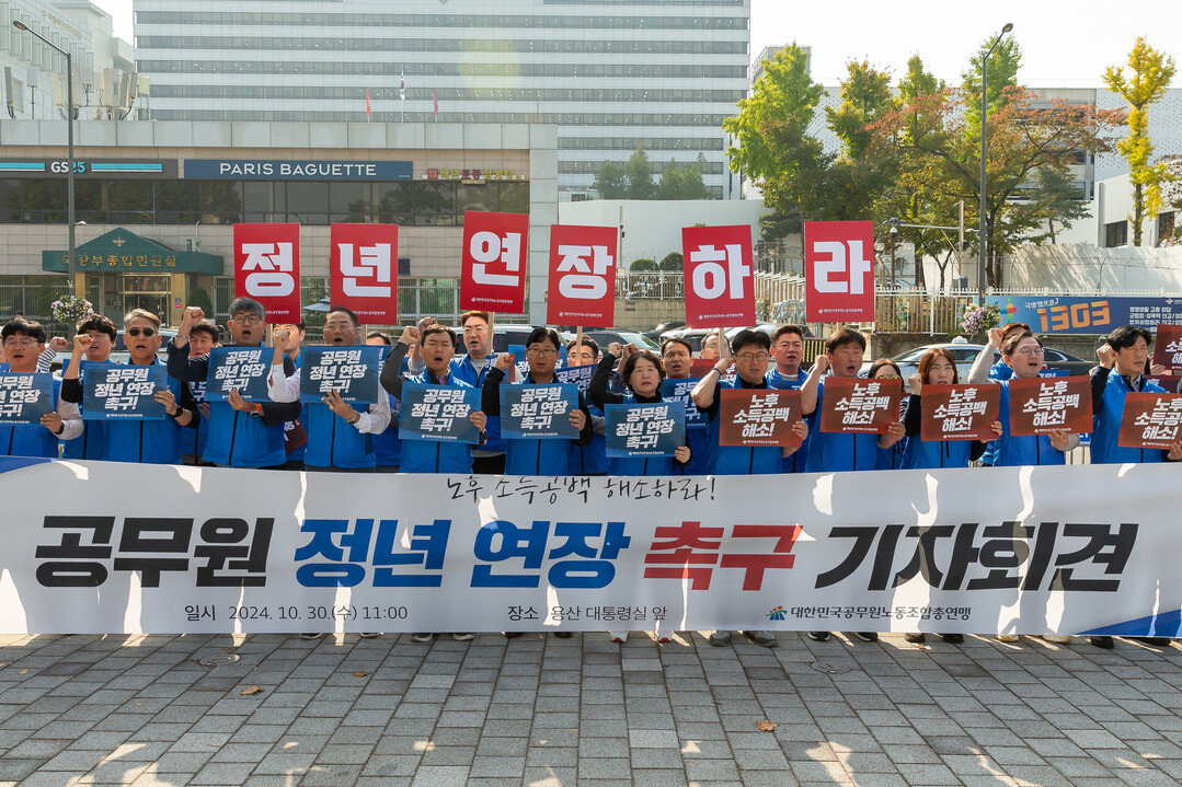 대한민국공무원노동조합총연맹(공노총)은 지난 10월 30일 용산 대통령실 일대에서 기자회견을 갖고 공무원 노후소득 공백 해소를 위한 정년 연장을 촉구했습니다. 공노총에 따르면 2022년부터 2032년까지 약 10만 명에 달하는 공무원이 노후소득 공백을 겪게 될 것으로 추산됩니다.