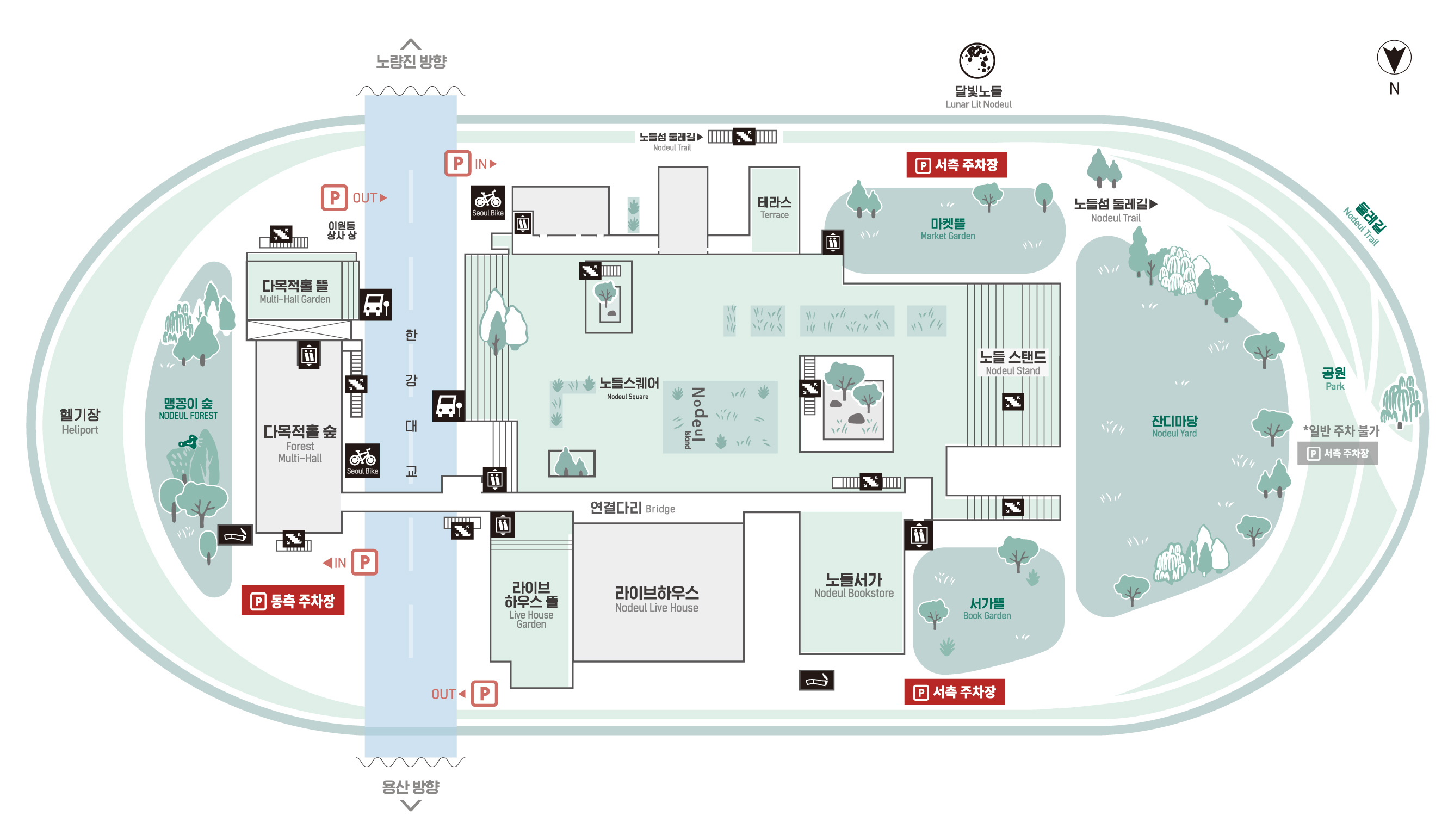자가용을 이용할 경우, 노들섬 내 주차장을 이용할 수 있지만 주차 공간이 제한적이므로 주변 공영주차장을 이용하는 것도 좋은 방법입니다. 이촌한강공원 주차장이나 용산가족공원 주차장 등을 이용할 수 있습니다.