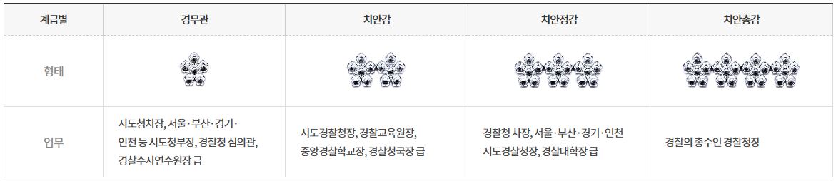이들의 계급장은 중앙에 태극장을 배치한 무궁화를 둘러싼 5개의 무궁화로 구성되어 있으며, 그 수에 따라 계급이 구분됩니다. 이는 '충(忠), 신(信), 인(仁), 의(義), 용(勇)'의 다섯 가지 경찰 가치를 상징합니다.