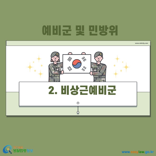 • 예비군: 전역 후 8년 차까지의 남성 (간부는 40세까지 등). 병역 의무가 있는 자에 한합니다.