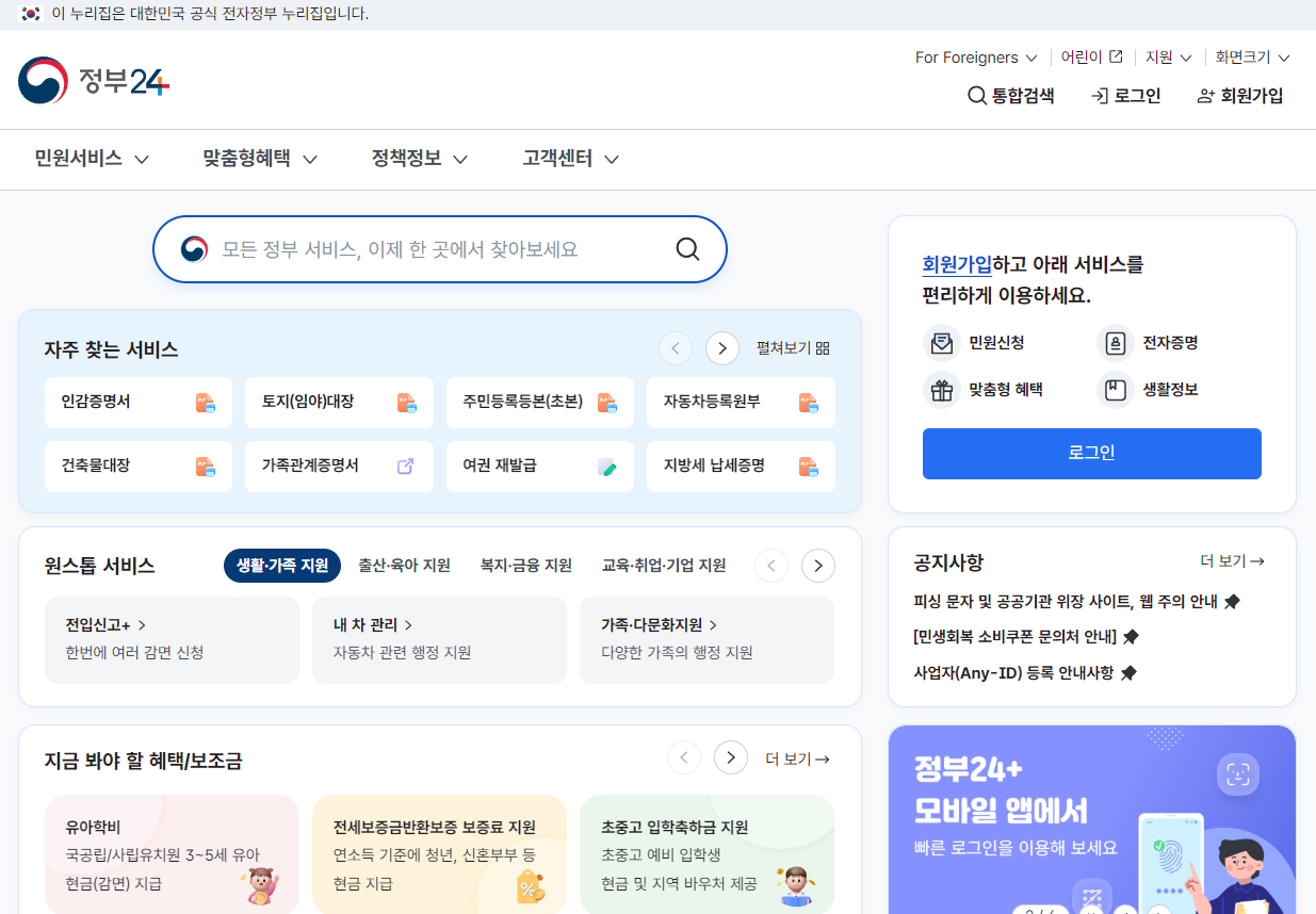 '정부24'는 대한민국 정부의 모든 민원 서비스를 한곳에 모아 놓은 온라인 포털입니다. 24시간 365일 언제 어디서든 민원 업무를 처리할 수 있어 매우 편리합니다.