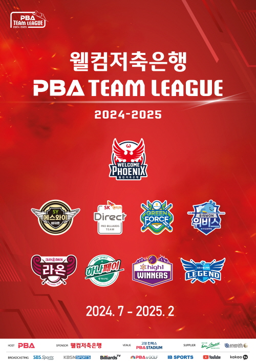 2024-07-15 ~ 2025-02-28 기간동안 고양 킨텍스 PBA 스타디움 에서 진행되는 웰컴저축은행 PBA 팀리그는 라운드 로빈 시스템 - 4단식 3복식의 경기방식으로 총 라운드 5R : 정규리그 (R1-R5) , 총 경기수180경기 (1R 36경기 X 5R) , 참가팀은 9개팀, 팀 구성은7~8명 (PBA 선수 4명이상, LPBA 선수 2명이상) 으로 진행됩니다. 웰컴저축은행 PBA 팀리그의 참가팀을 알아보겠습니다.