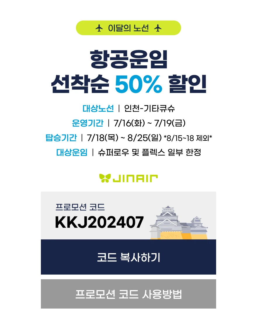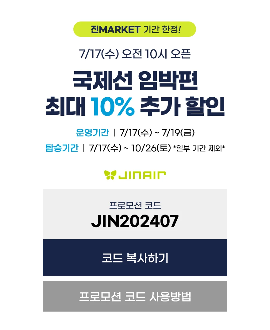 진에어가 2024년 하반기 연중 최대 특가 운임 프로모션인 '진마켓(Jin Market)'을 오픈했다. 이번 프로모션은 7월 16일부터 19일까지 4일간 진행되며, 국내선 및 국제선 노선을 대상으로 한다.