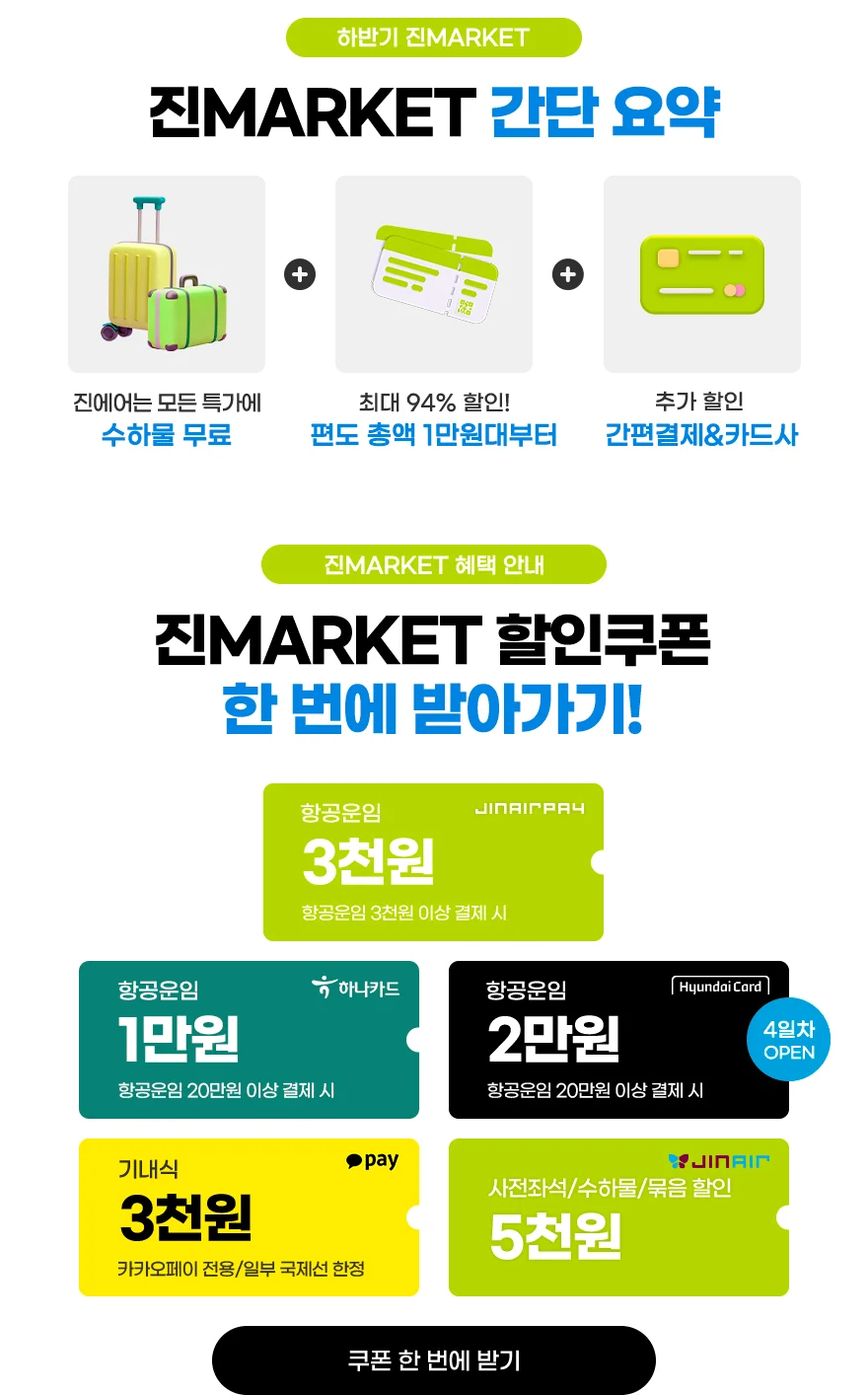이번 진마켓에서는 다양한 할인 혜택이 제공된다. 주요 할인 쿠폰으로는 진에어페이 3천원, 하나카드 1만원, 현대카드 2만원, 부가서비스 5천원, 카카오페이 기내식 3천원 등이 있다.