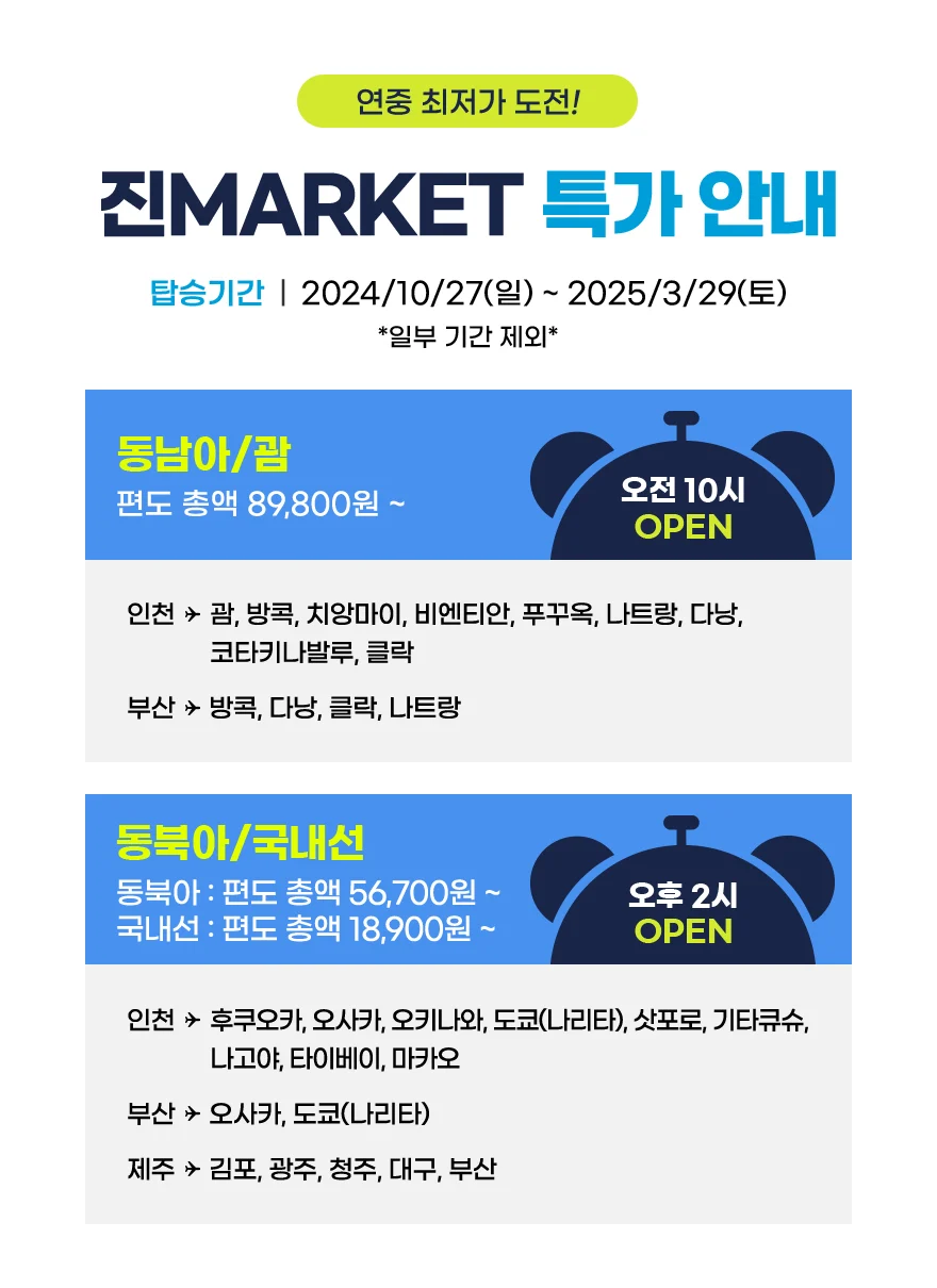 진에어는 이번 진마켓을 통해 고객들에게 파격적인 항공권 할인 혜택을 제공할 예정이다. 특히 이번 프로모션은 동계 시즌이 시작하는 10월 27일부터 2025년 3월 29일까지의 탑승 기간을 대상으로 한다.