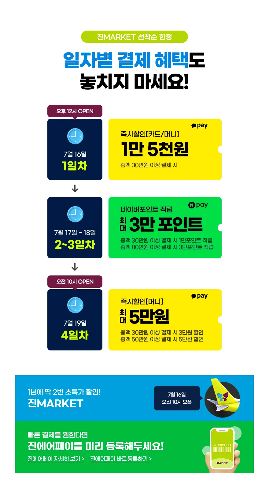 진에어는 이번 진마켓에서 일자별로 카카오페이 및 네이버페이 결제 시 추가 혜택을 제공하는 타임세일도 마련했다. 이를 통해 고객들은 더욱 다양한 결제 수단을 활용하여 추가적인 할인 혜택을 누릴 수 있게 되었다.