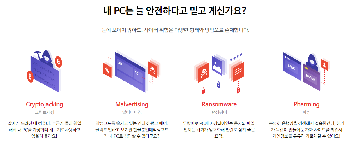 - 실시간 감시 : 인터넷 검색, 프로그램 설치 등 PC 사용 중 발생하는 위협을 실시간으로 탐지하고 방어합니다.