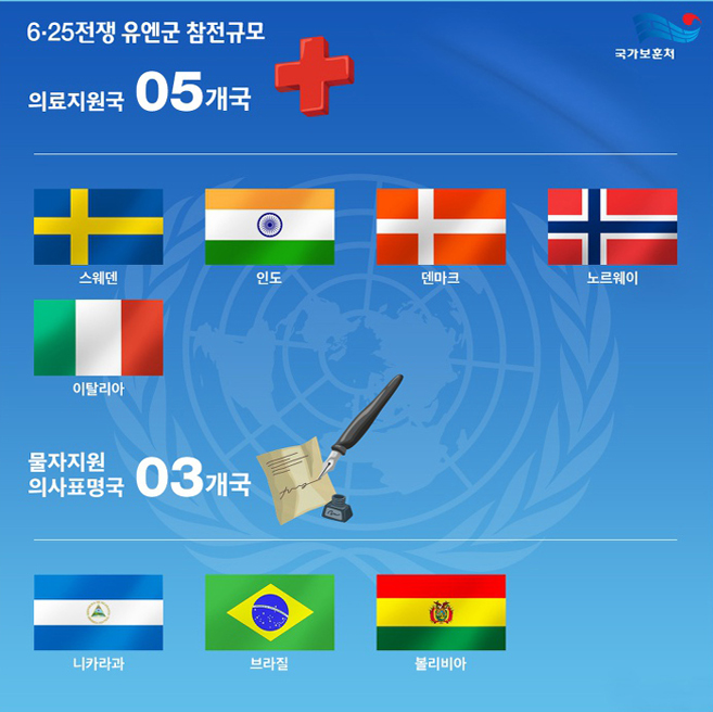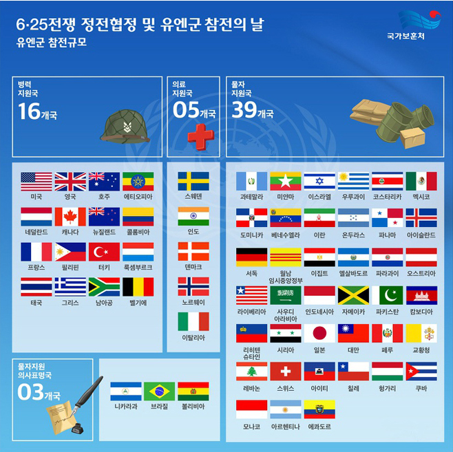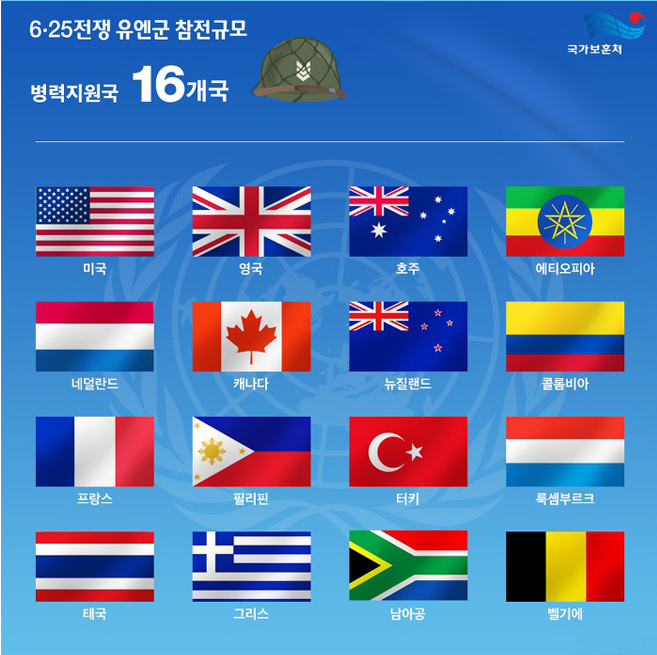 미국을 필두로 영국, 캐나다, 터키, 호주, 뉴질랜드, 남아프리카 공화국, 필리핀, 태국, 에티오피아, 프랑스, 벨기에, 네덜란드, 룩셈부르크, 그리스, 콜롬비아 등 총 16개국이 전투 병력을 파견했습니다. 이들 국가의 참전 용사들은 이름 모를 산야에서 피를 흘리며 공산군과 싸웠고, 수많은 젊은이들이 대한민국 땅에 잠들었습니다. 미국의 희생이 가장 컸지만, 터키군의 용맹함, 캐나다군의 임진강 전투, 영연방군의 설마리 전투 등 각국 군인들의 영웅적인 활약은 한국전쟁사에 깊이 새겨져 있습니다.