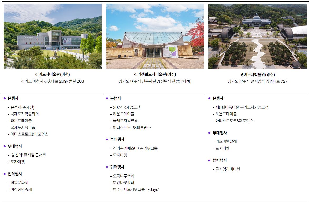 행사는 경기도자미술관(이천), 경기생활도자미술관(여주), 경기도자박물관(광주)을 중심으로 경기도 전역에서 진행됩니다. 본행사, 부대행사, 협력행사 등 다양한 프로그램으로 구성되어 있어 관람객들에게 풍성한 경험을 제공할 예정입니다.