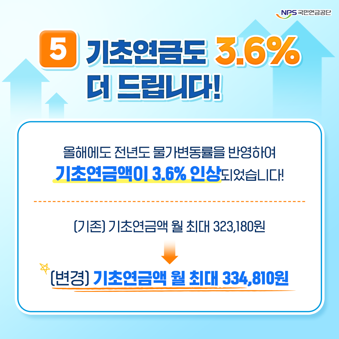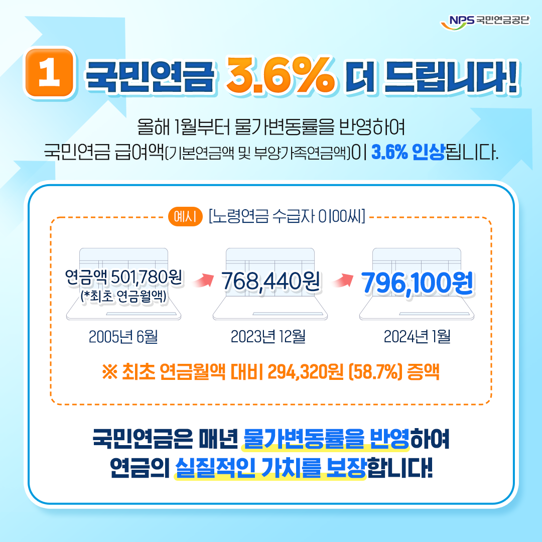 2024년부터는 국민연금 수령액과 납부액에도 변화가 있습니다. 먼저, 노령연금과 기초연금 지급액이 물가상승분을 반영해 3.6% 인상되었습니다. 예를 들어, 2023년 11월에 620,000원의 노령연금을 받던 사람은 2024년 1월부터 22,320원(3.6%) 인상된 642,320원을 받게 됩니다.