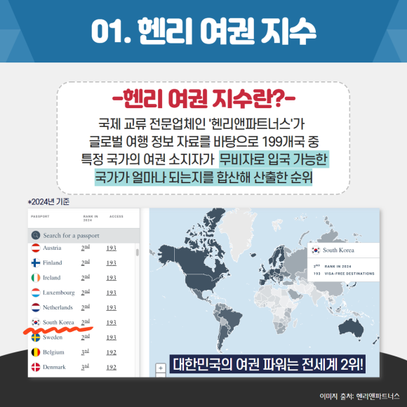 헨리 여권 지수란 영국의 국제 교류 전문업체 '헨리앤파트너스(Henly & Partners)'가 글로벌 여행 자료를 바탕으로 199개국 중 특정 국가의 여권 소지자가 무비자로 입국이 가능한 국가가 얼마나 되는지를 합산해 산출한 순위 를 의미합니다. 2024년 기준, 대한민국의 헨리 여권 지수 순위는 2위로 무려 193개국에 무비자로 입국이 가능하다고 나와있습니다.