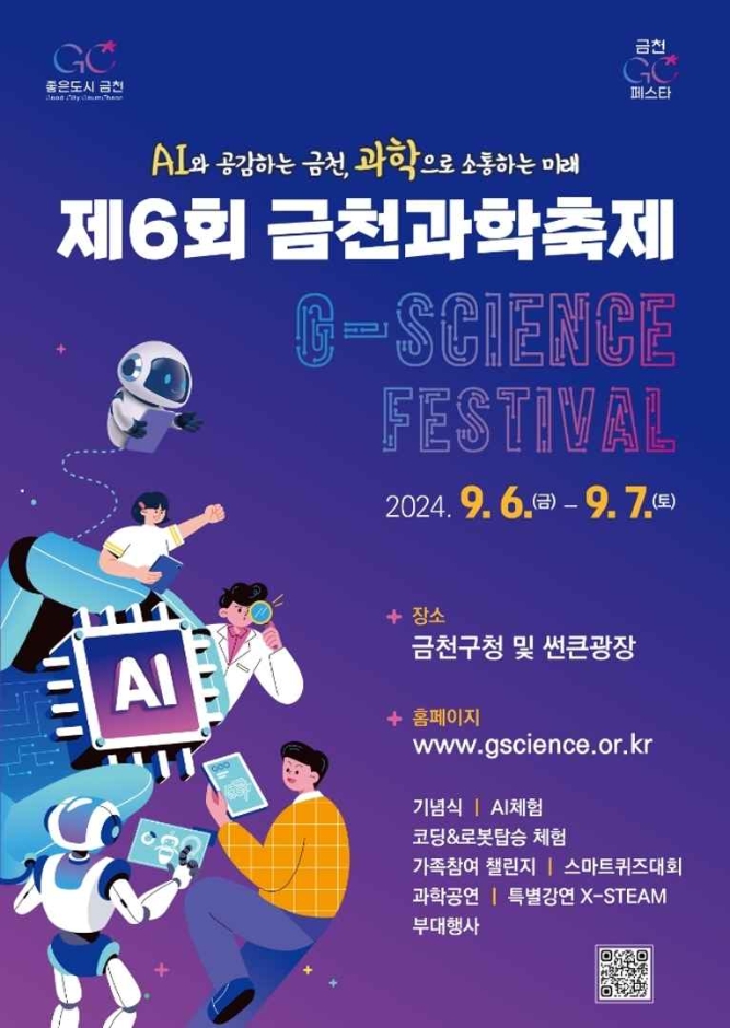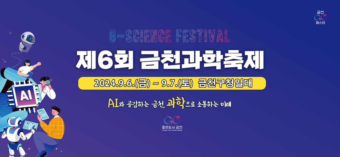 제6회 금천과학축제 「2024 G-Science Festival」이 서울 금천구에서 2024년 9월 6일부터 7일까지 개최됩니다. 이번 축제의 주제는 "과학으로 다시 만나는 세계, 디지털 금천"으로, 최신 과학기술과 디지털 혁신을 체험할 수 있는 다채로운 프로그램이 준비되어 있습니다.