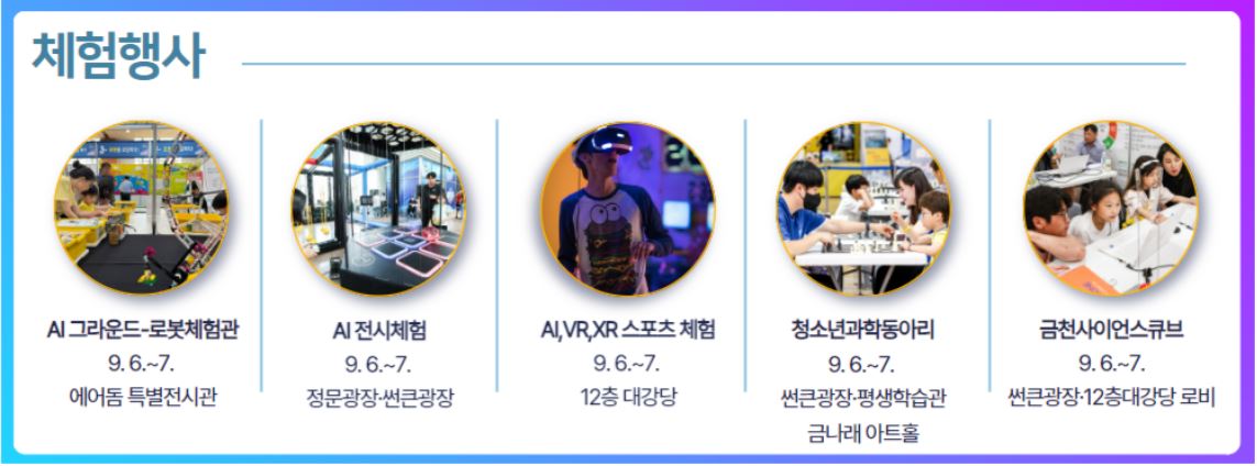 주요 프로그램으로는 AI, 로봇, 코딩, VR(가상현실), AR(증강현실), XR(확장현실) 등 최신 기술을 직접 체험할 수 있는 다양한 체험 부스가 마련되어 있습니다. 이를 통해 참가자들은 미래 기술의 현재와 미래를 생생하게 경험할 수 있습니다.