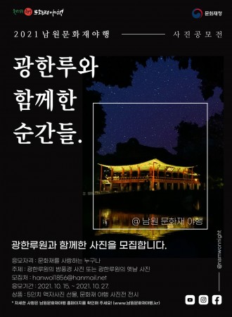 남원문화유산야행은 한국의 전통문화와 역사를 밤의 아름다움과 결합한 특별한 축제입니다. 2024년 10월 3일부터 6일까지 4일간 펼쳐지는 이 행사는 "광한청허부, 달나라 궁전으로 초대"라는 매력적인 주제로 방문객들을 맞이합니다. 광한루원과 요천월궁광장 일원에서 진행되는 이 축제는 남원의 풍부한 문화유산을 새로운 시각으로 경험할 수 있는 기회를 제공합니다.