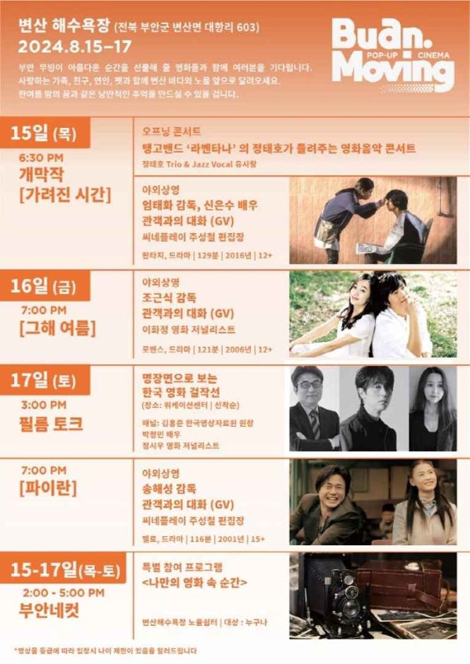 2024년 8월 15일부터 17일까지 전라북도 부안군 변산해수욕장에서 '2024 부안무빙 변산 비치 시네마'가 개최됩니다. 이 영화 축제는 아름다운 노을을 배경으로 영화를 감상할 수 있는 특별한 경험을 제공합니다.