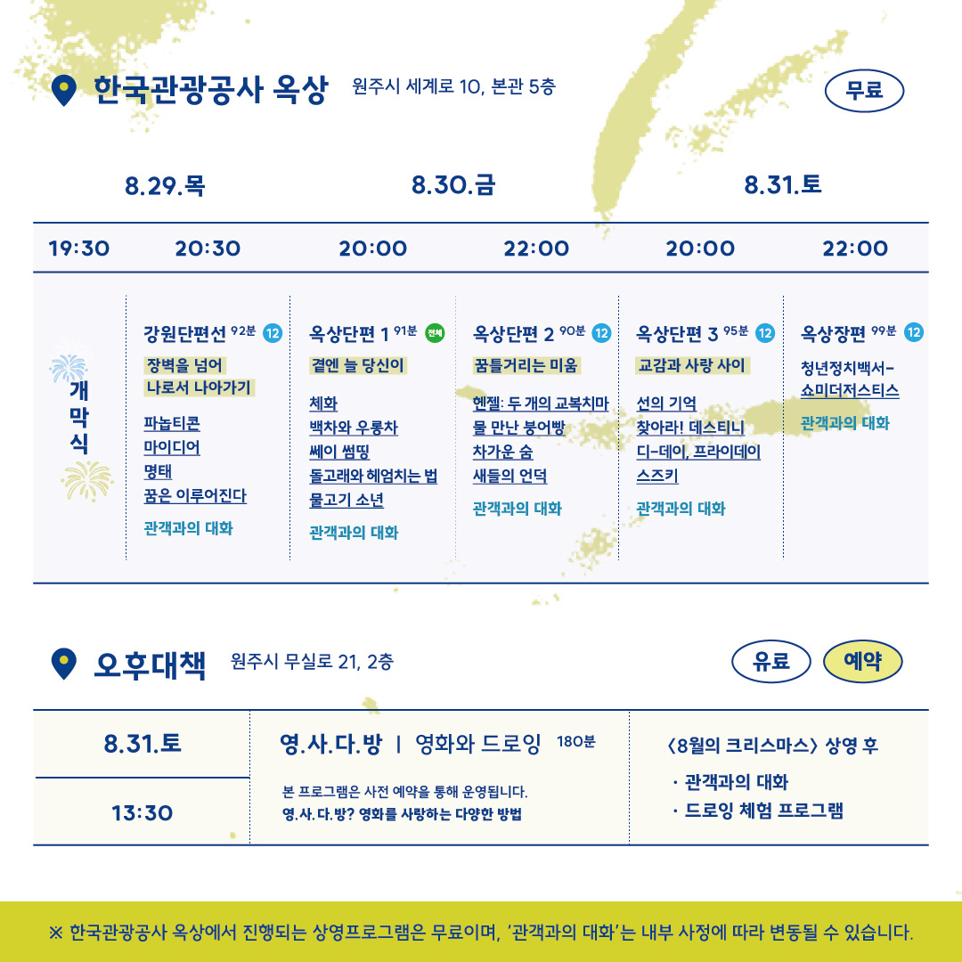 원주시민들뿐만 아니라 영화를 사랑하는 모든 이들에게 2024 원주옥상영화제는 놓칠 수 없는 문화 행사가 될 것입니다. 여름의 끝자락, 원주의 옥상에서 펼쳐지는 영화의 향연을 기대해 봅니다.