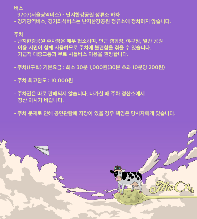 2024 THE CRY ground의 무대가 될 난지한강공원은 서울시 마포구에 위치한 한강시민공원의 한 구역입니다. 이 공원은 넓은 잔디밭과 한강의 아름다운 전망을 자랑하며, 다양한 야외 활동과 행사를 즐기기에 적합한 장소로 알려져 있습니다.