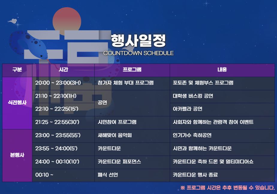 - 본 행사 (23:00 ~ 23:55): 새해맞이 신년 음악회 및 인기가수 축하공연