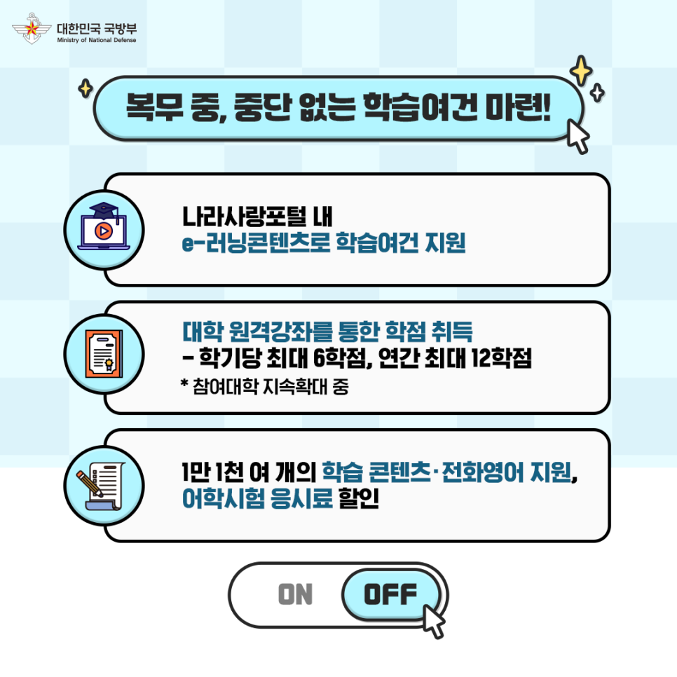 군 복무 기간 동안 병사들이 학업을 이어가거나 새로운 기술을 배울 수 있도록 다양한 자기 계발 기회가 제공되고 있습니다. 원격 강좌 수강, 자격증 취득 지원, 독서 환경 조성 등 병사들이 군 생활을 통해 성장할 수 있는 발판이 마련되고 있습니다. 또한, 체육 활동, 문화 행사 등 여가 활동도 이전보다 훨씬 다양해졌습니다.