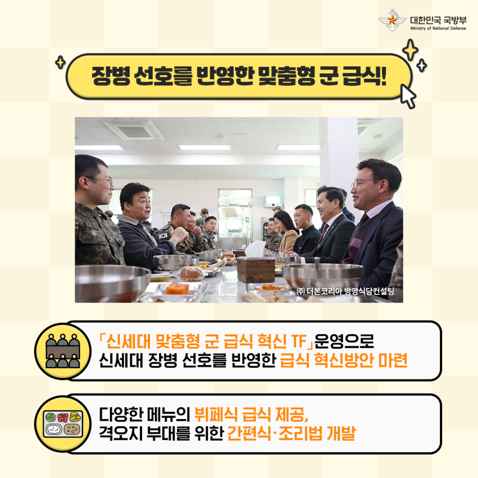 - 기술 기반의 스마트 병영 구현: AI 기반의 경계 시스템, 로봇 활용 등 첨단 기술을 적극적으로 도입하여 비전투 업무를 줄이고, 장병들이 핵심 임무에 집중할 수 있는 환경을 조성해야 합니다.